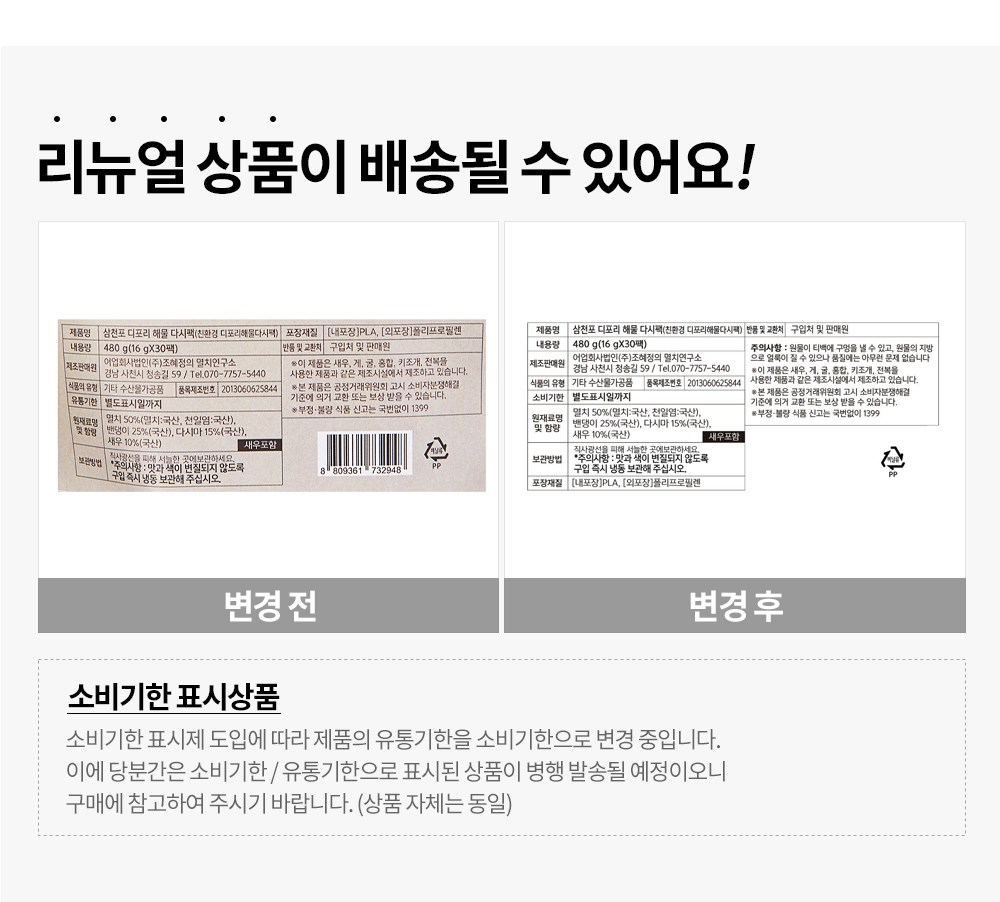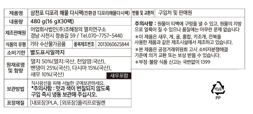 | 제품명 | 삼천포 디포리해물다시팩 | 식품의 유형 | 기타 수산물가공품 |