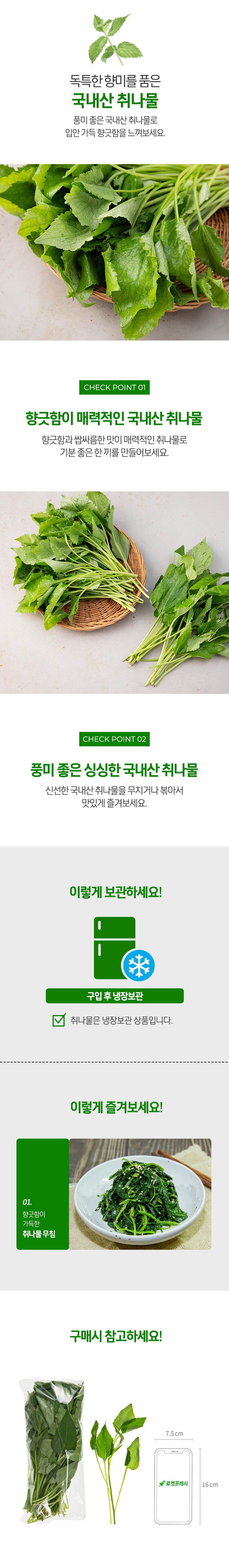 | 품목 또는 명칭 | 국내산 취나물 | 포장단위별 내용물의 용량(중량),수량,크기 | 200gx1개 |