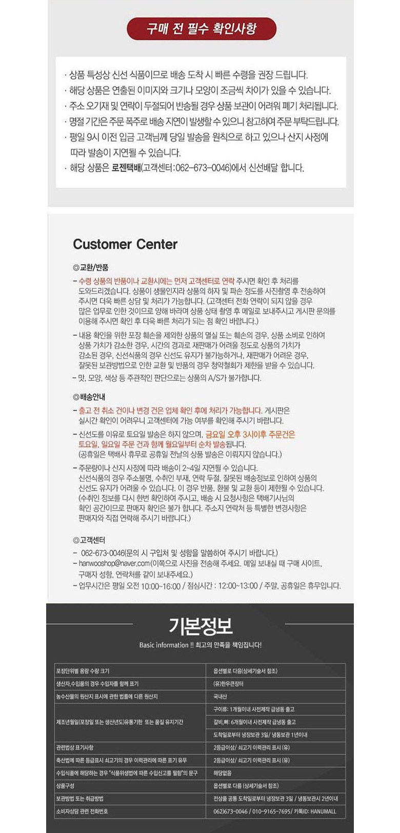 | 배송방법 | 신선/냉장/냉동 | 배송비 | 무료배송 - 도서산간 지역 배송불가 |