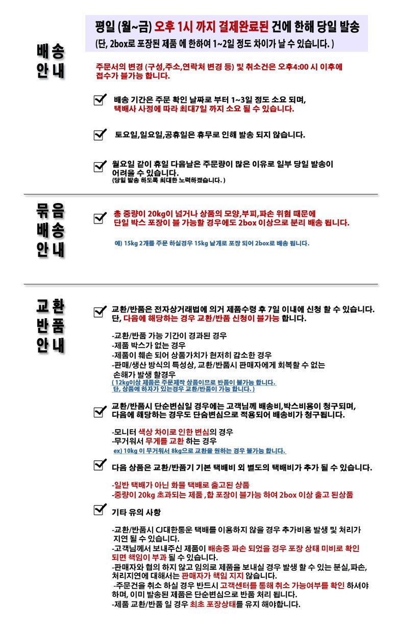- ㆍ교환/반품에 관한 일반적인 사항은 판매자가 제시사항보다 관계법령이 우선합니다.