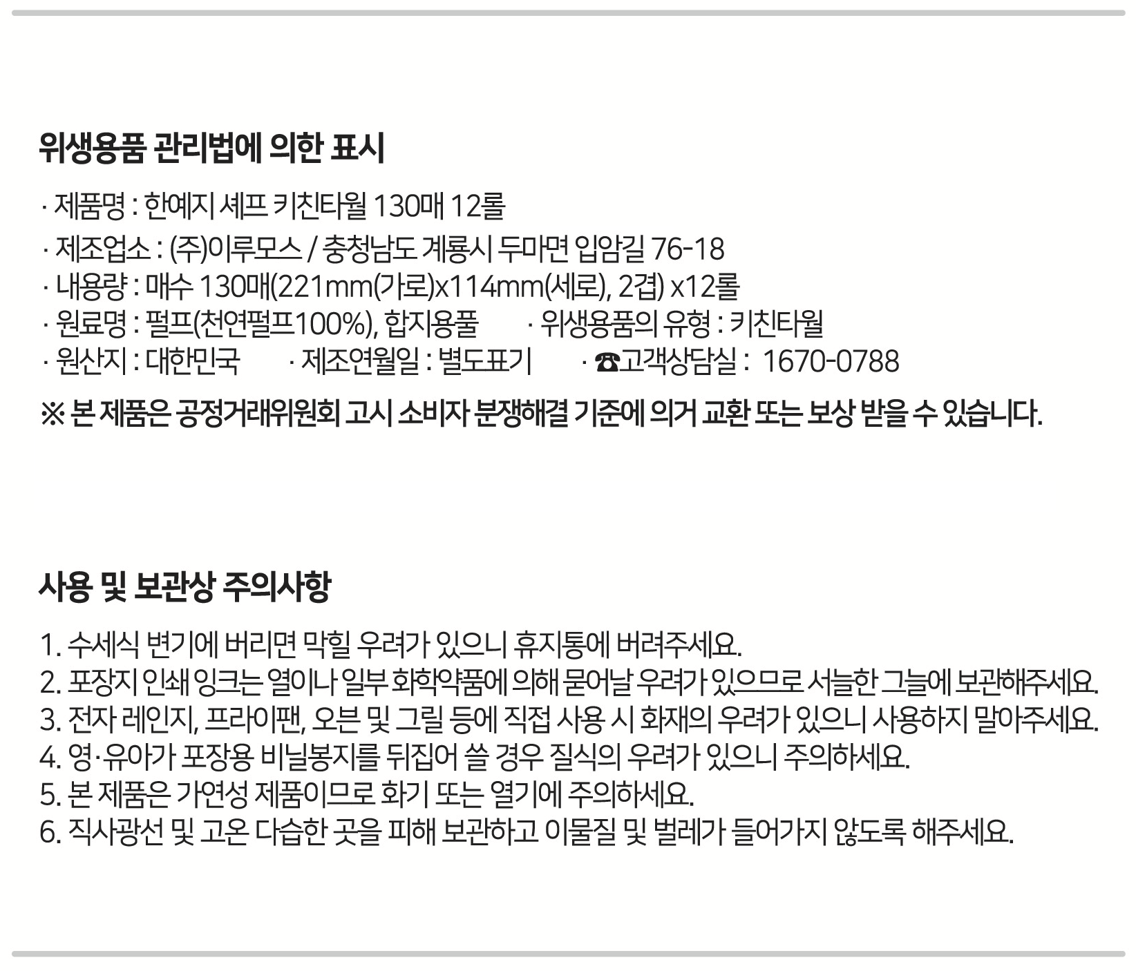 | 품명 및 모델명 | 한예지 셰프 키친타올 | 인증/허가 사항 | 해당없음 |