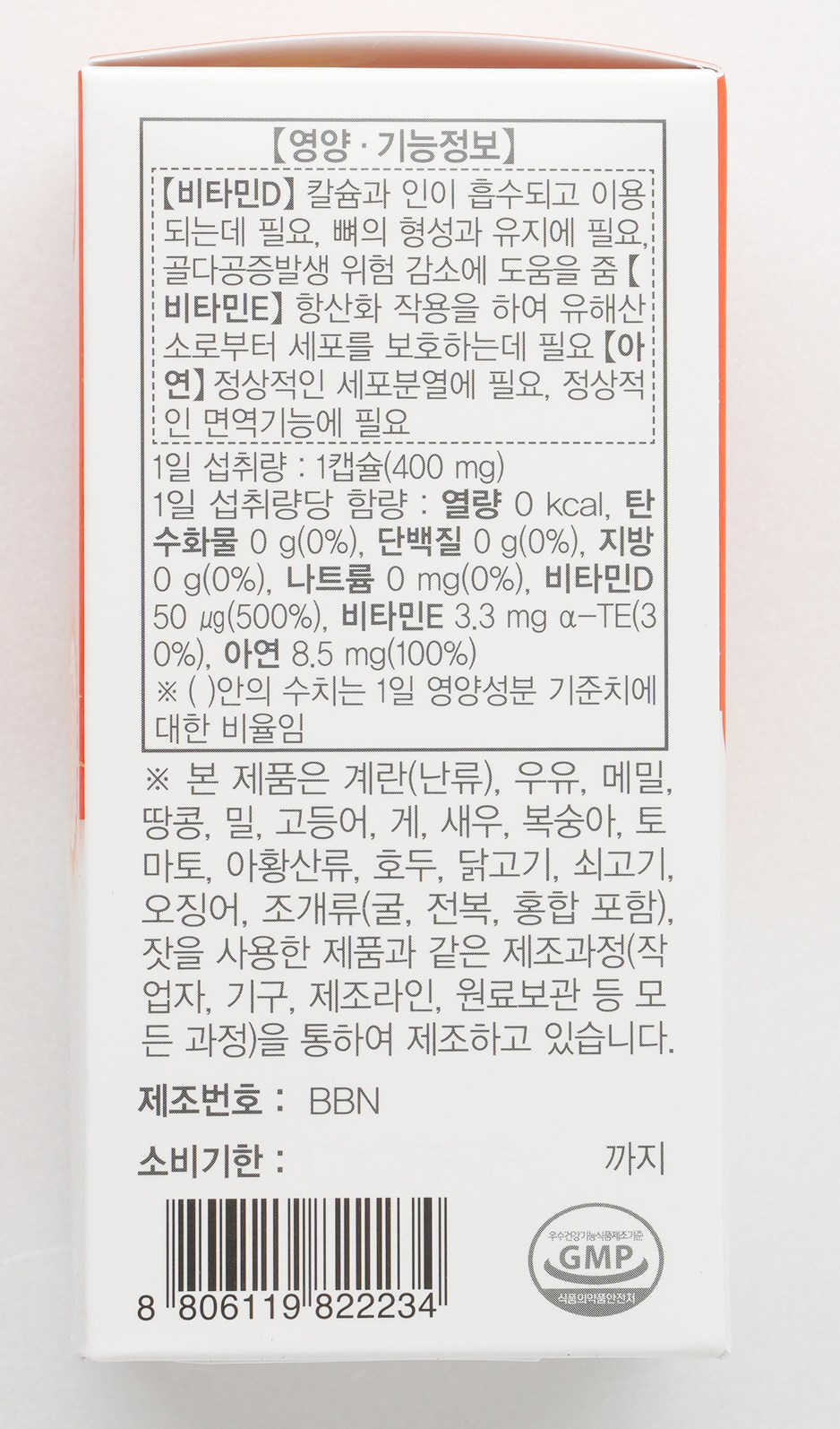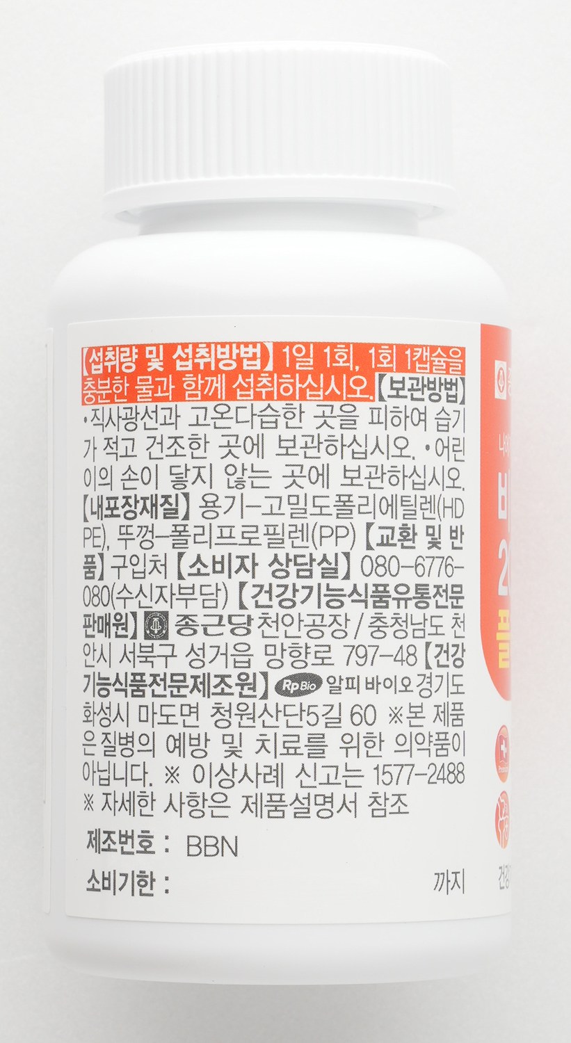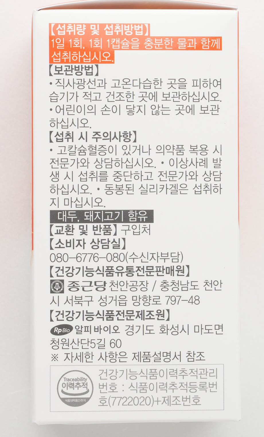 | 소비기한 및 보관방법 | 소비기한(또는 유통기한) : 2027년 03월 08일 이거나 그 이후인 상품 제조년월일 : 2025년 03월 09일 이후인 제조상품 보관방법: 컨텐츠 참조 | 포장단위별 내용물의 용량(중량), 수량 | 36g(90캡슐) x 3개 |