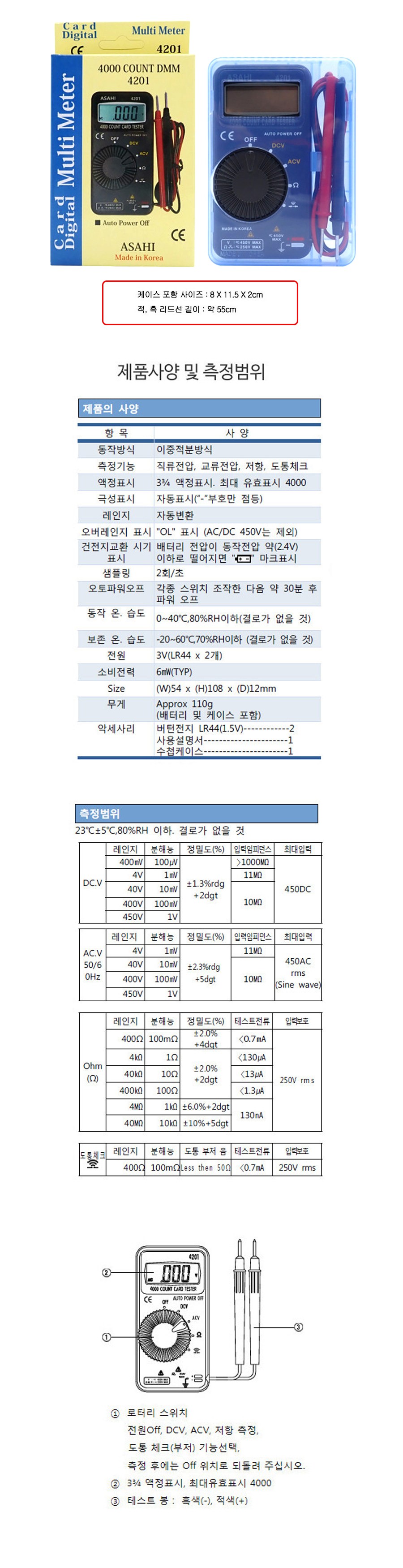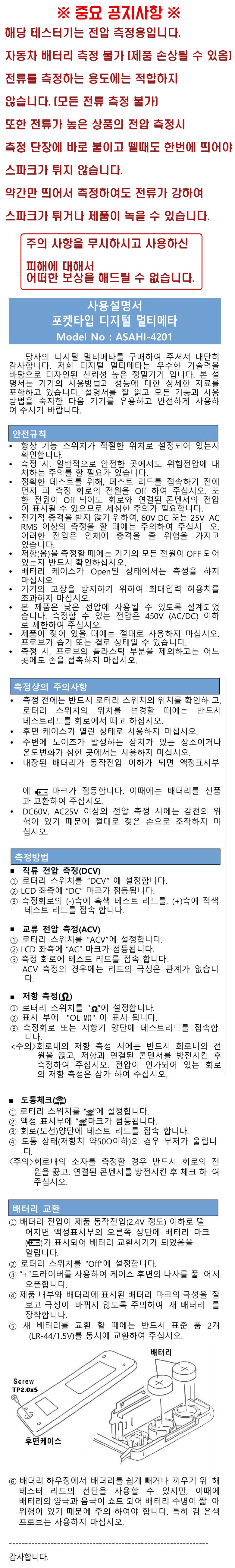 | 품명 및 모델명 | 아사히 디지털 멀티 포켓테스터기 4201 | 인증/허가 사항 | 해당없음 |