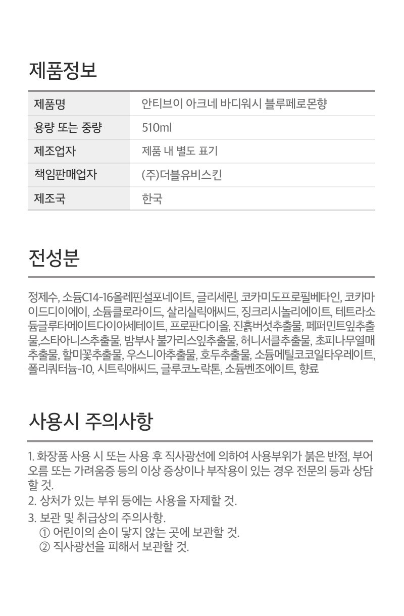 | 용량(중량) | 510ml | 제품 주요 사양 | 모든 피부용 |