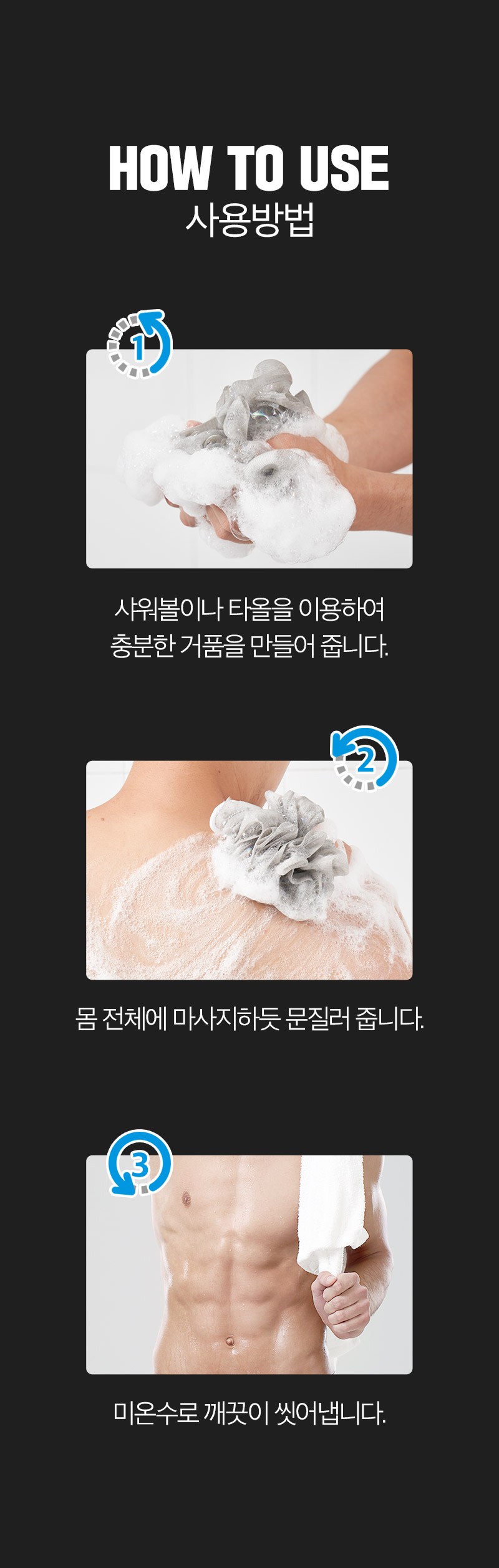 | 사용기한 또는 개봉 후 사용기간 | 본 상품은 해당 물류센터 직발송 상품인 관계로 제조연월일 및 사용기한 정보가 매번 변경되므로 상단 사용기한 정보를 참고해 주세요. | 사용방법 | 샤워 타올이나 샤워볼에 적당량을 덜어 충분히 거품을 내주세요. 전신에 마사지하듯 문지른 뒤 미온수로 깨끗이 씻어냅니다. |