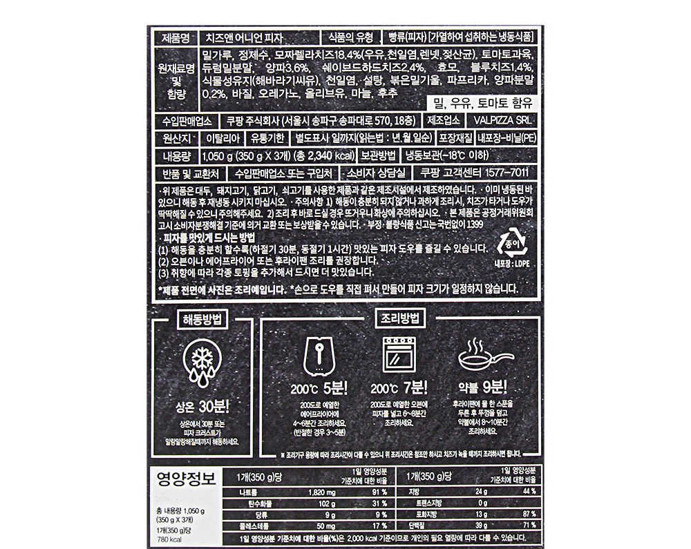 200℃로 예열한 오븐에 피자를 넣고 6~8분간 조리해주세요.