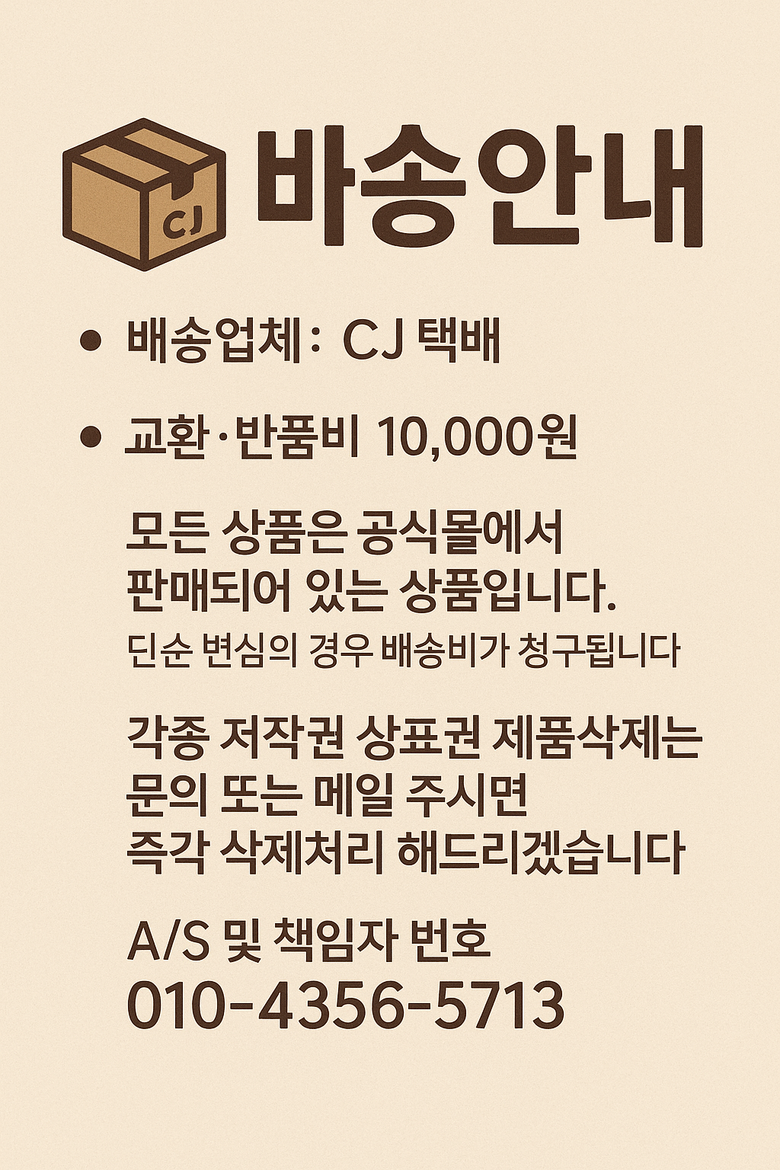 | 교환/반품 비용 (왕복비용) | 16,000원 - 단, 고객 변심의 경우에만 발생 - 도서산간 지역 배송불가 |