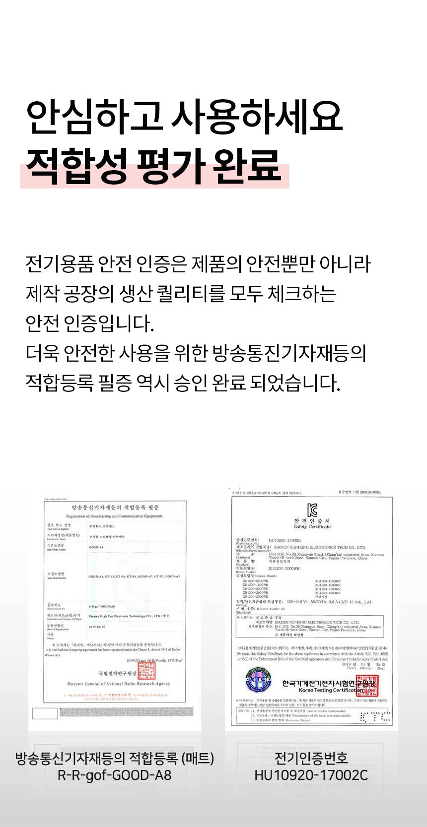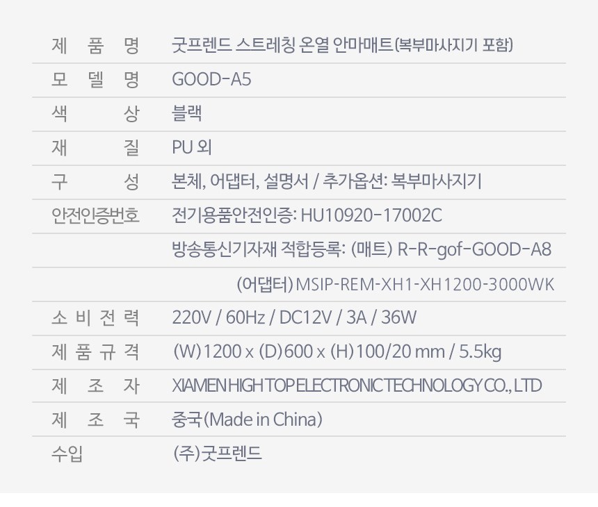| 품명 및 모델명 | 굿프렌드 스마트 안마매트 / GOOD-A5 | KC 인증정보 | 본품 : R-R-gof-GOOD-A8, 어댑터 : HU10920-17002C, MSIP-REM-XH1-XH1200-3000WK |