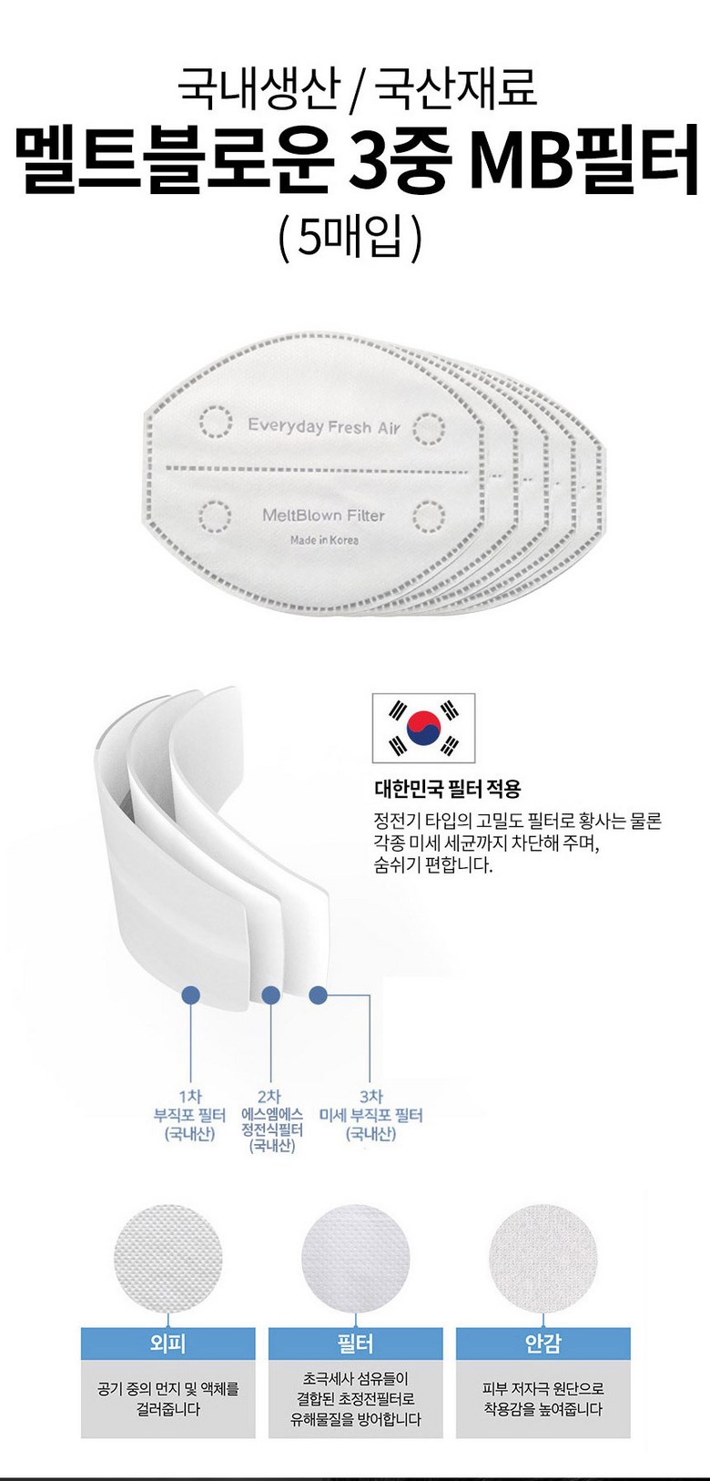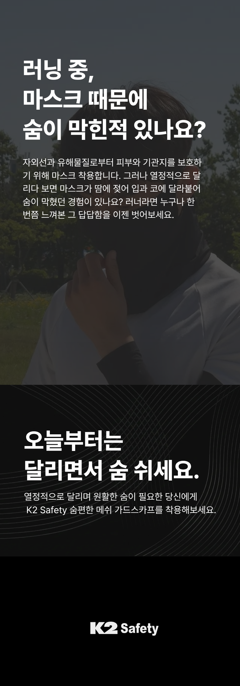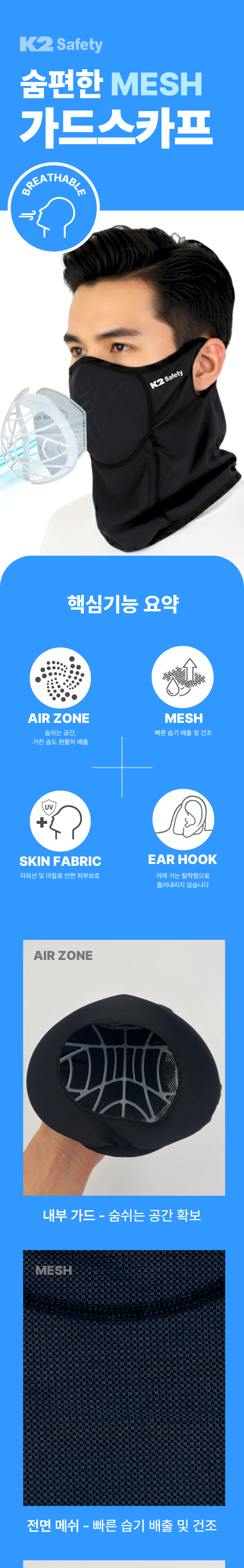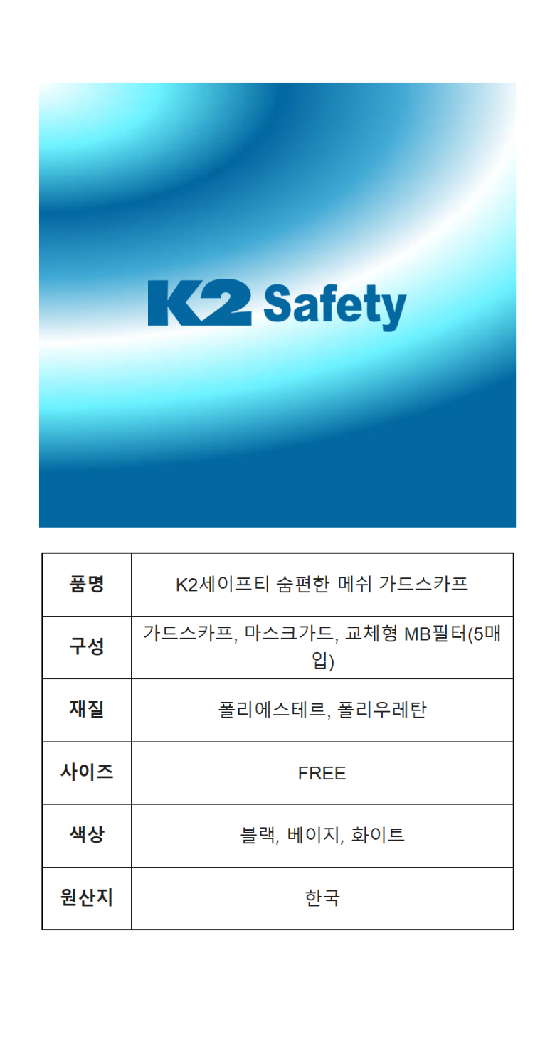 | 품명 및 모델명 | K2 세이프티 메쉬 숨편한 가드스카프 + 3중 교체형 마스크 필터 | KC 인증정보 | 가드스카프 : 유 / KC마크 , 마스크 필터 : 해당없음 |