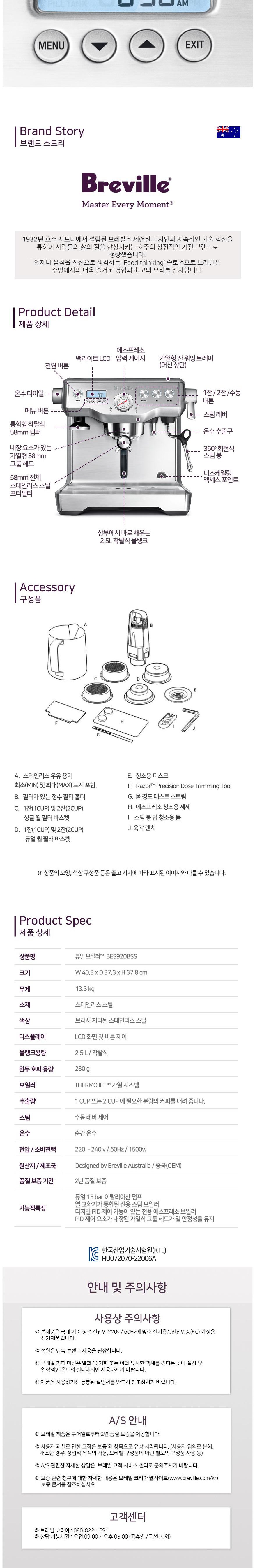 | 품명 및 모델명 | Coffee Maker / BES920 | KC 인증정보 | HU072070-22006A, R-R-Brv-BES920 |