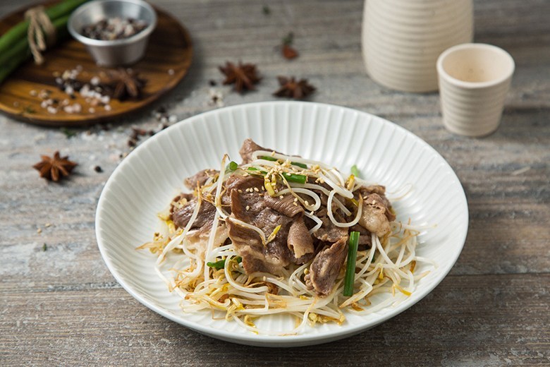재료: 차돌박이 200 g, 숙주 적당량, 쪽파 적당량, 간장 2큰술, 굴 소스 1큰술, 설탕 1큰술, 참기름 1큰술, 다진 마늘 약간, 소금 약간, 후추 약간, 오일 약간