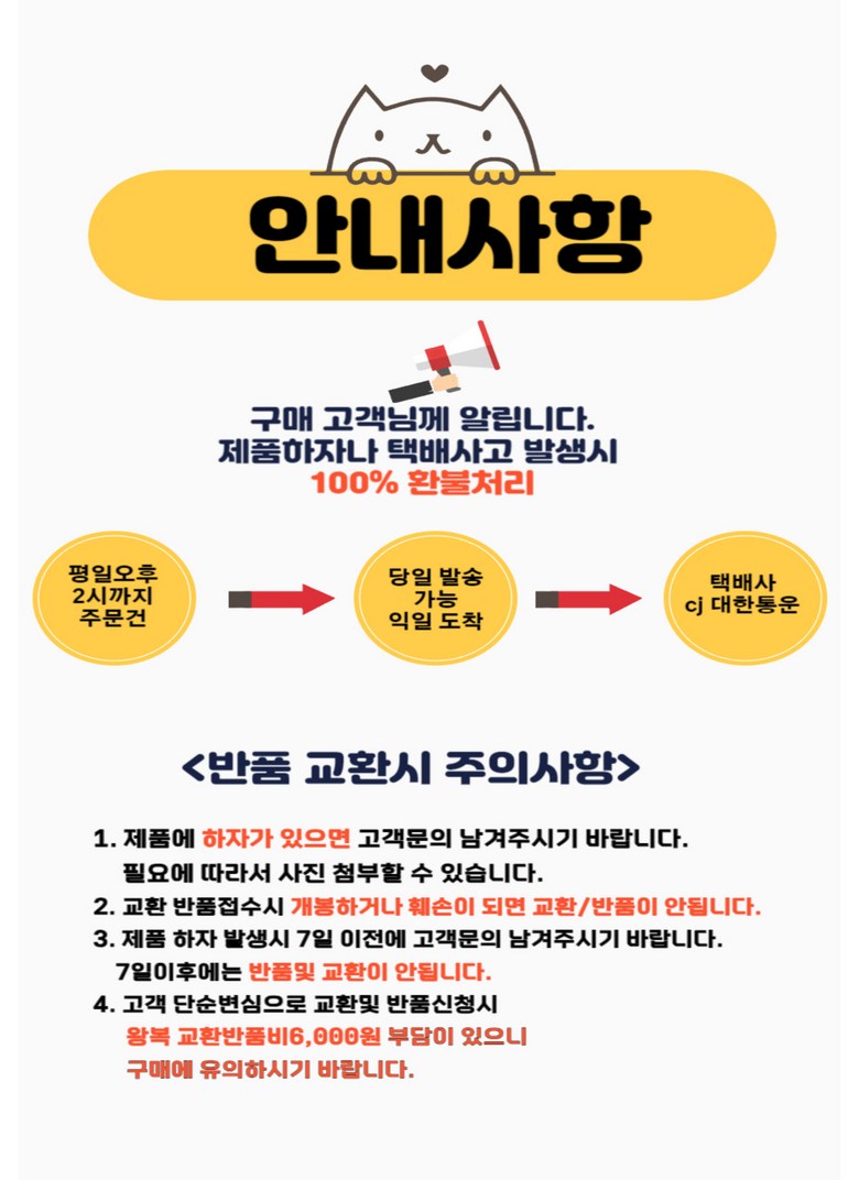 - ㆍ모니터 해상도의 차이로 인해 색상이나 이미지가 실제와 달라, 고객이 단순 변심으로 교환/반품을 무료로 요청하는 경우