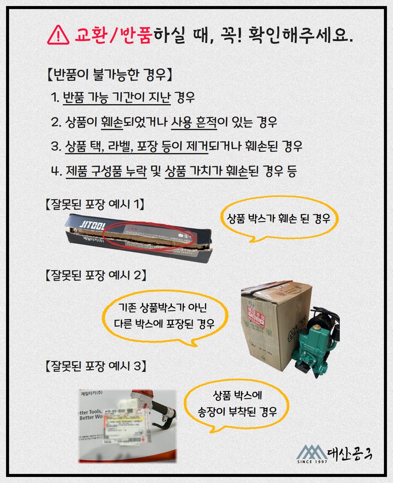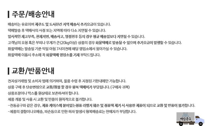 - ㆍ교환/반품에 관한 일반적인 사항은 판매자가 제시사항보다 관계법령이 우선합니다.