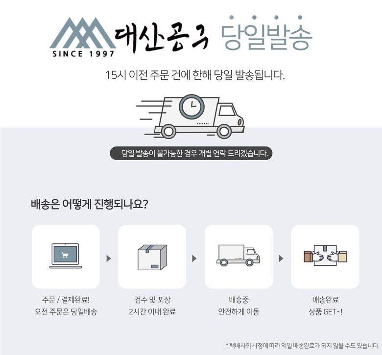 | 배송기간 | ㆍ도서산간 지역 등은 배송에 3-5일이 더 소요될 수 있습니다. - 천재지변, 물량 수급 변동 등 예외적인 사유 발생 시, 다소 지연될 수 있는 점 양해 부탁드립니다. | ||