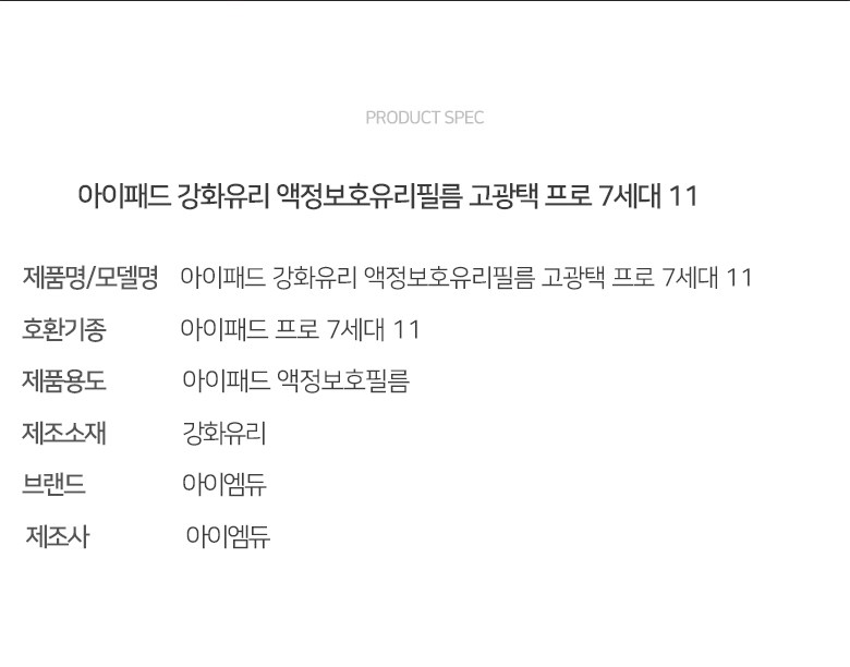| 품명 및 모델명 | 아이엠듀 아이패드 고광택 풀커버 강화유리 액정보호필름 | 인증/허가 사항 | 본품: 해당없음 / 알콜솜: FB20-02-0058 |