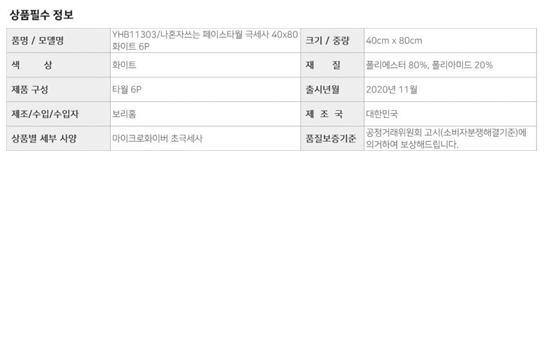 | 품명 및 모델명 | 나혼자쓰는 페이스타월 극세사 40x80 화이트 6개 | 인증/허가 사항 | 해당없음 |