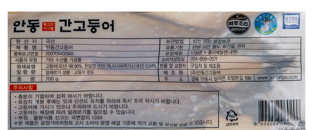 | 생산자 및 소재지 | ㈜안동간고등어 / 경북 안동시 일직면 조탑본길 168 | 제조연월일, 소비기한 또는 품질유지기한 | 업데이트 예정 |
