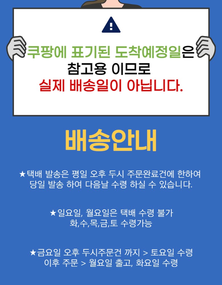 - ㆍ모니터 해상도의 차이로 인해 색상이나 이미지가 실제와 달라, 고객이 단순 변심으로 교환/반품을 무료로 요청하는 경우