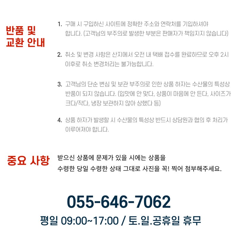 - ㆍ교환/반품에 관한 일반적인 사항은 판매자가 제시사항보다 관계법령이 우선합니다.