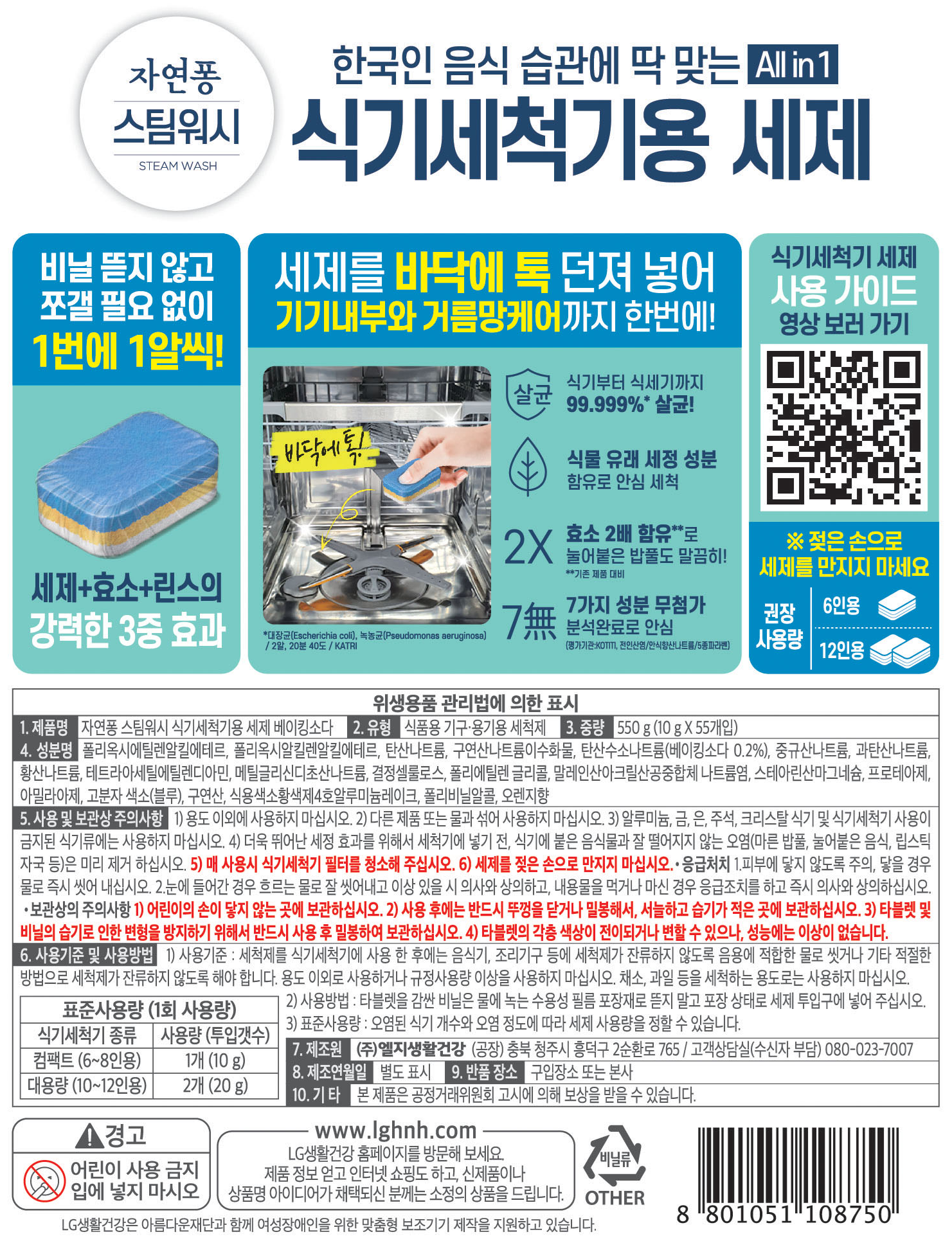 | 품명 및 모델명 | 자연퐁 스팀워시 식기세척기용 세제 베이킹소다 | 인증/허가 사항 | 위생용품 |