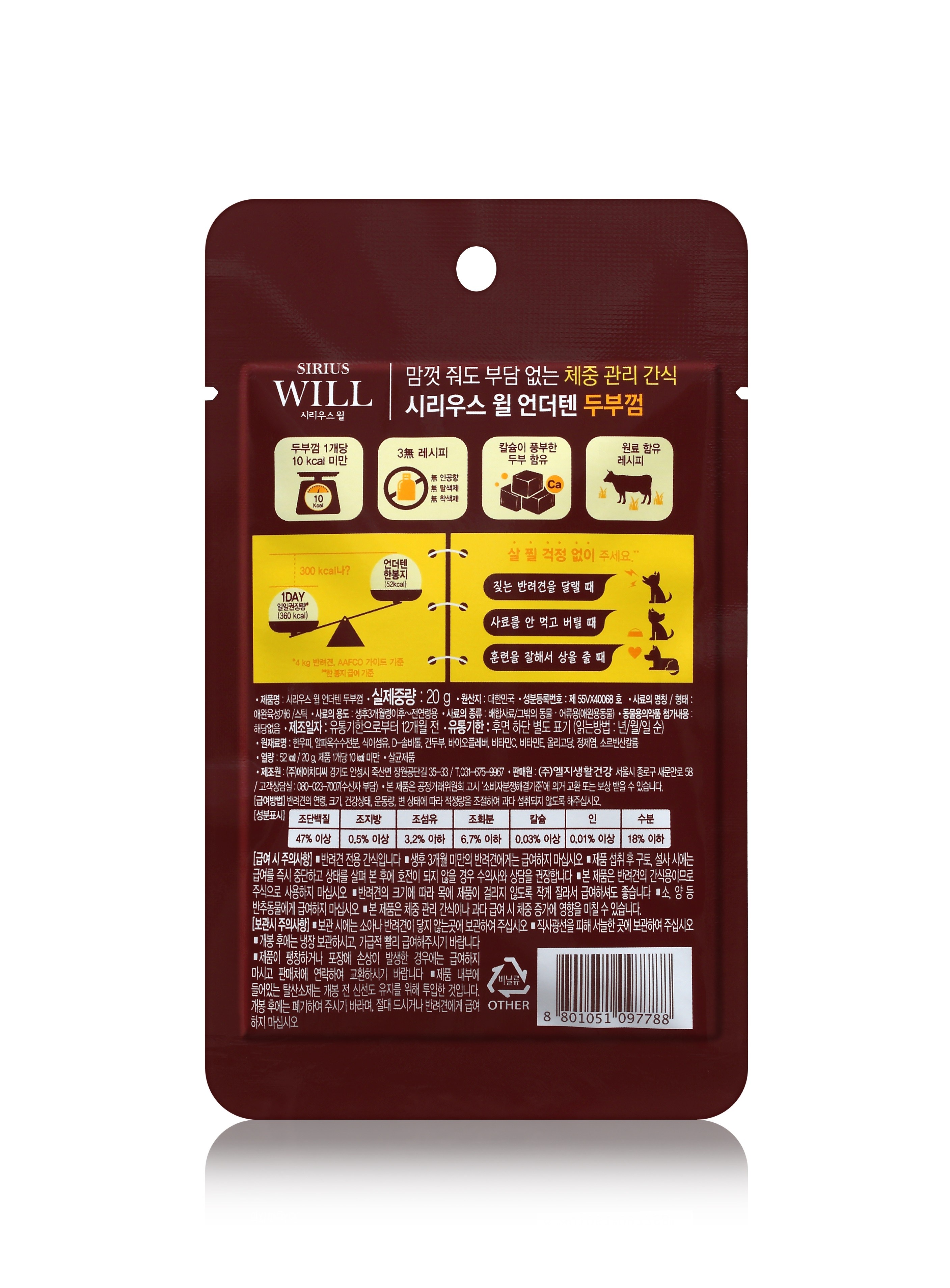 | 품명 및 모델명 | 시리우스 윌 언더텐 두부껌 | 인증/허가 사항 | 사료관리법에 따른 성분등록번호 : 컨텐츠 참조 |