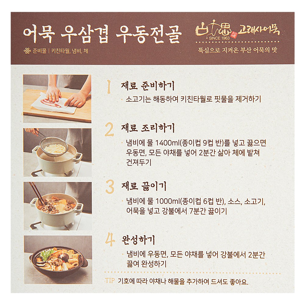 소고기, 어묵, 우동면, 버섯, 채소, 소스로 구성되어 있습니다. 레시피에 따라 차근차근 조리해보세요. 기호에 따라 해물을 추가해 드셔도 좋답니다.