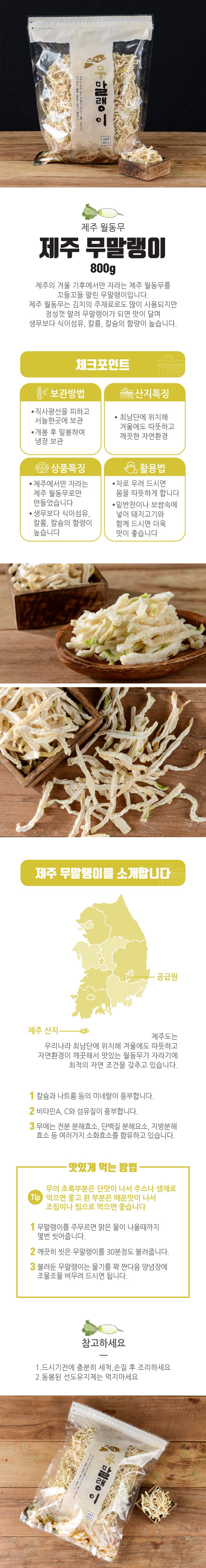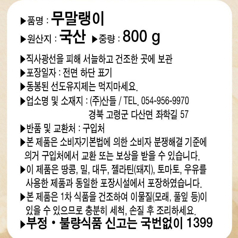 | 품목 또는 명칭 | 무말랭이 | 포장단위별 내용물의 용량(중량),수량,크기 | 800g, 1개 |