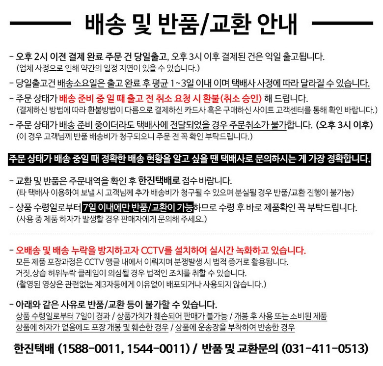 - ㆍ교환/반품에 관한 일반적인 사항은 판매자가 제시사항보다 관계법령이 우선합니다.
