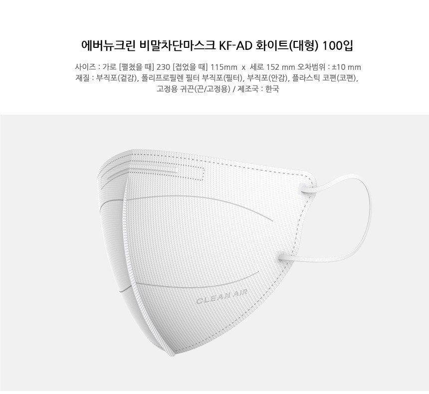| 품명 및 모델명 | 에버뉴크린 비말마스크(KF-AD)(대형)(화이트) | 인증/허가 사항 | 의약외품 |