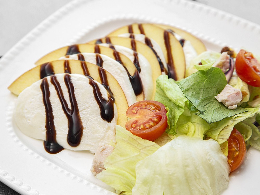 재료: 모짜렐라 부라타 치즈 100g, 방울토마토 5개, 딸기 4개, 샐러드 채소 적당량, 발사믹 식초 1컵, 레몬 1개, 엑스트라버진 올리브유 적당량, 소금 약간, 후춧가루 약간