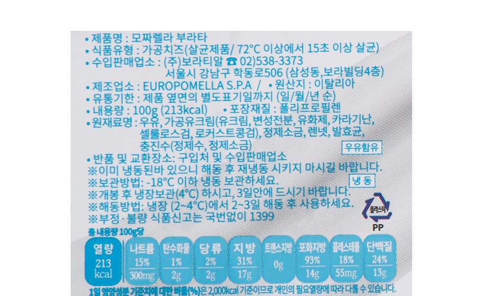 | 제품명 | 모짜렐라 부라타 | 식품의 유형 | 자연치즈(살균제품 / 72도 이상에서 15초 이상 살균) |