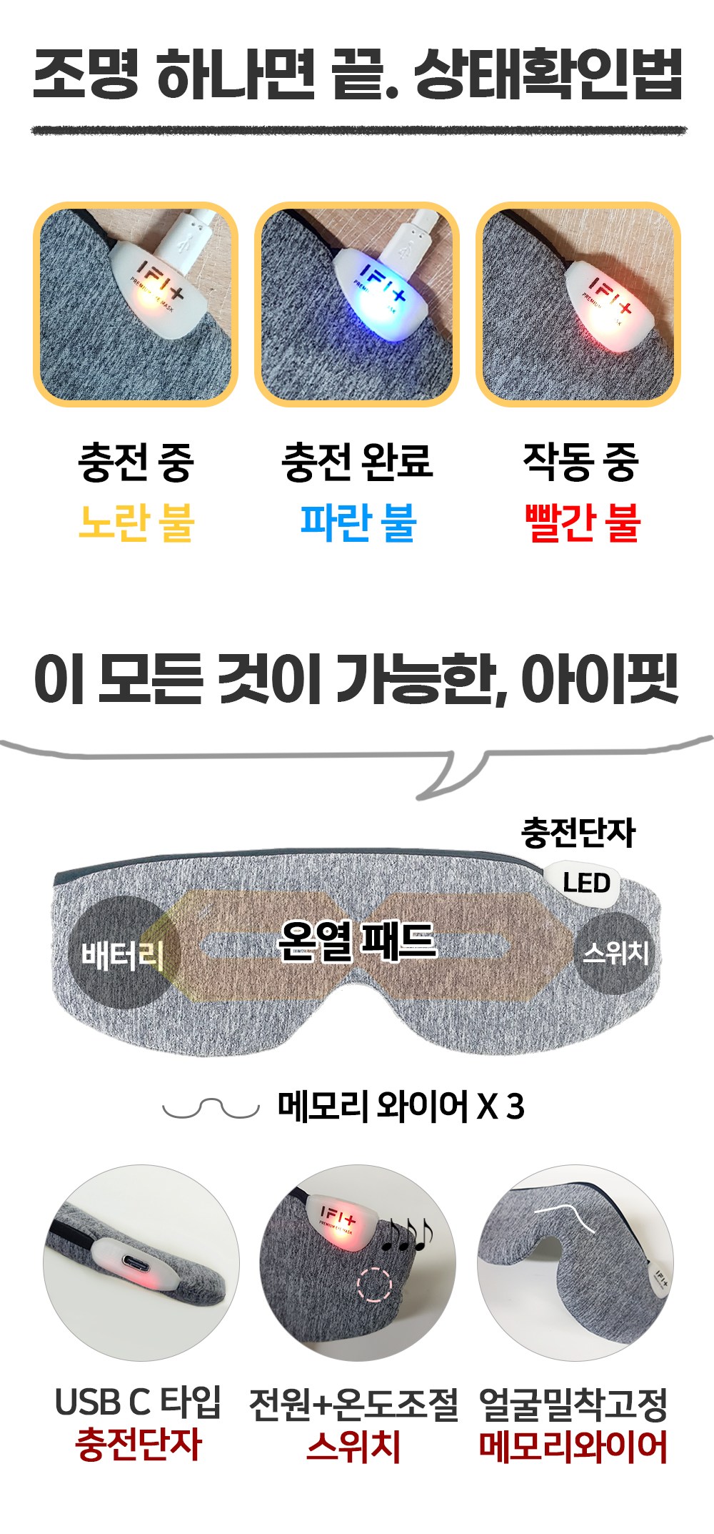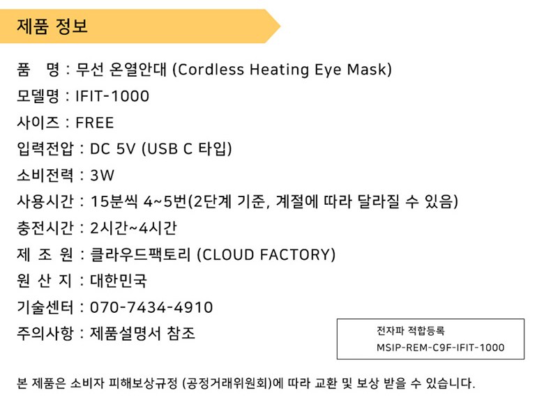 | 품명 및 모델명 | 무선 온열안대 IFIT-1000 | KC 인증정보 | ZU10288-16001I, MSIP-REM-C9F-IFIT-1000 |