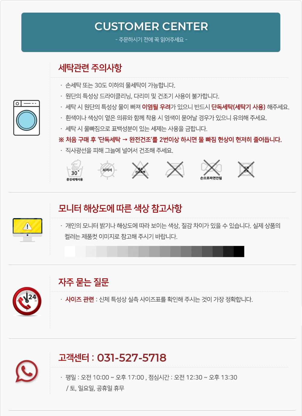 - ㆍ모니터 해상도의 차이로 인해 색상이나 이미지가 실제와 달라, 고객이 단순 변심으로 교환/반품을 무료로 요청하는 경우