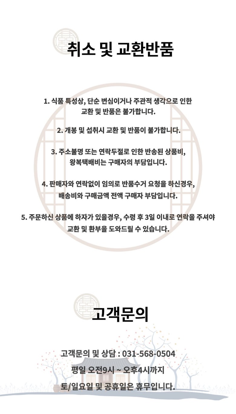 - 상품문의 및 후기게시판을 통해 취소나 환불, 반품 등은 처리되지 않습니다.