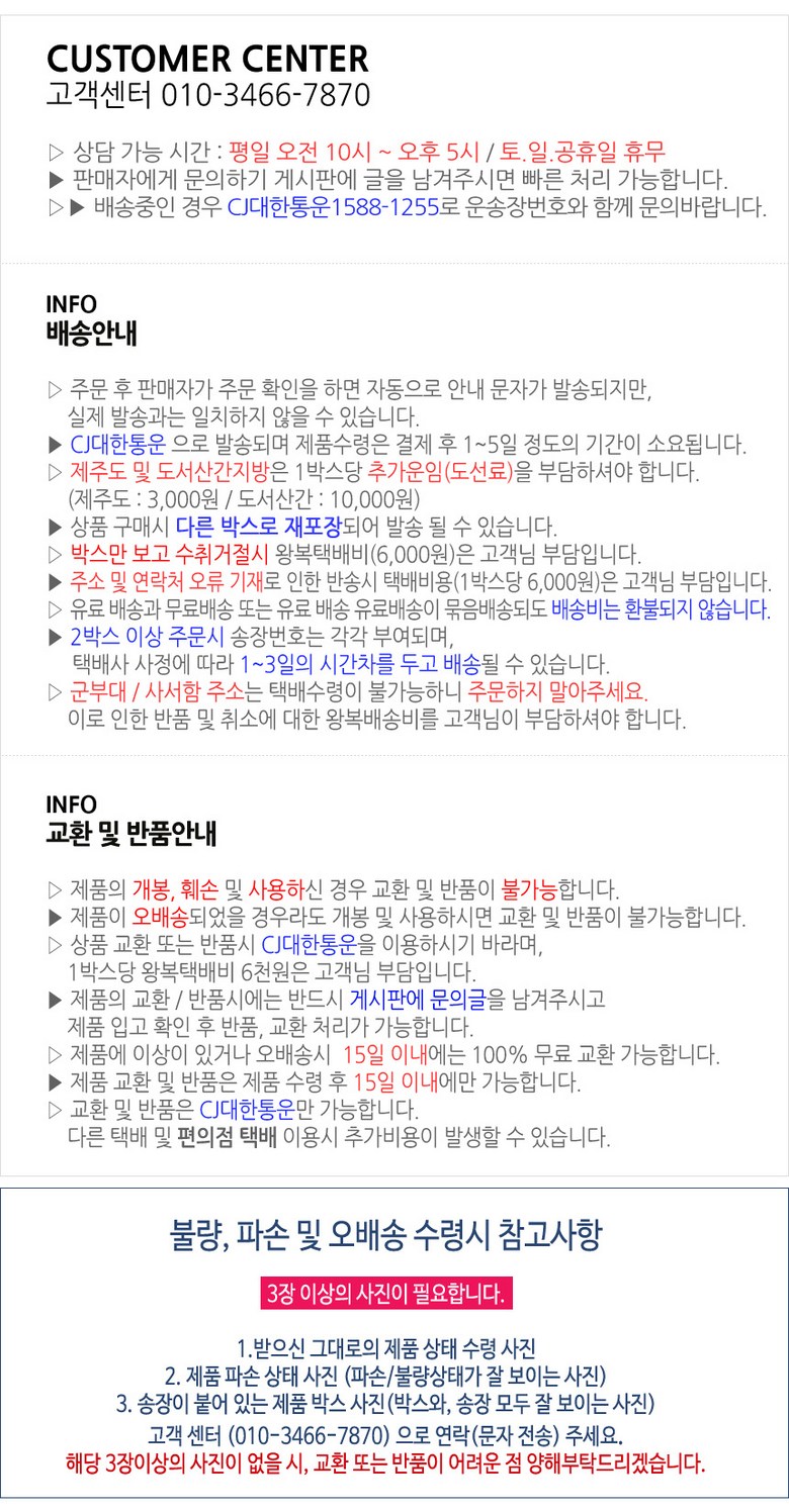 | 교환/반품 비용 (왕복비용) | 3,000원 - 단, 고객 변심의 경우에만 발생 - 도서산간 지역 배송불가 |