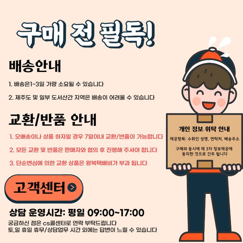 - ㆍ교환/반품에 관한 일반적인 사항은 판매자가 제시사항보다 관계법령이 우선합니다.