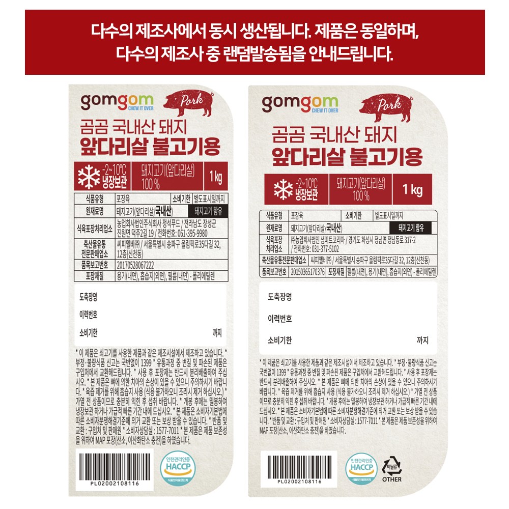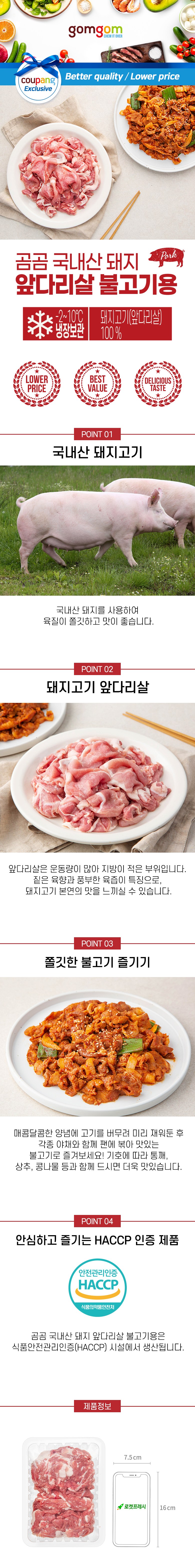 | 품목 또는 명칭 | 곰곰 국내산 돼지 앞다리살 불고기용 | 포장단위별 내용물의 용량(중량),수량,크기 | 1000g x 3개,1개 |