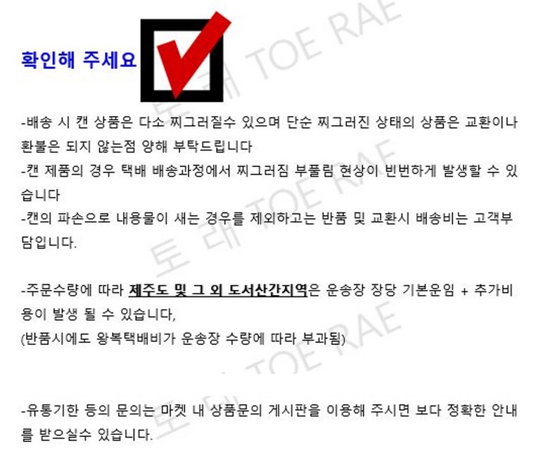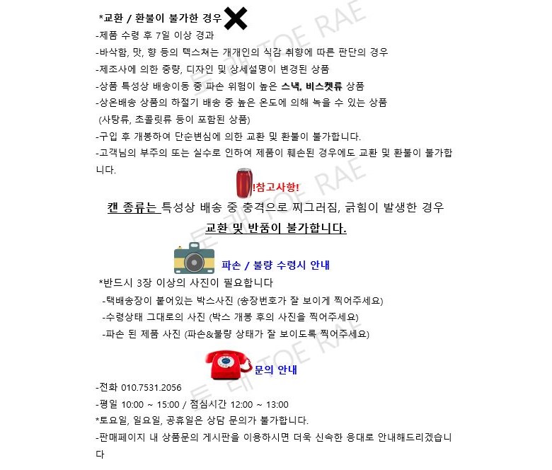 - ㆍ교환/반품에 관한 일반적인 사항은 판매자가 제시사항보다 관계법령이 우선합니다.