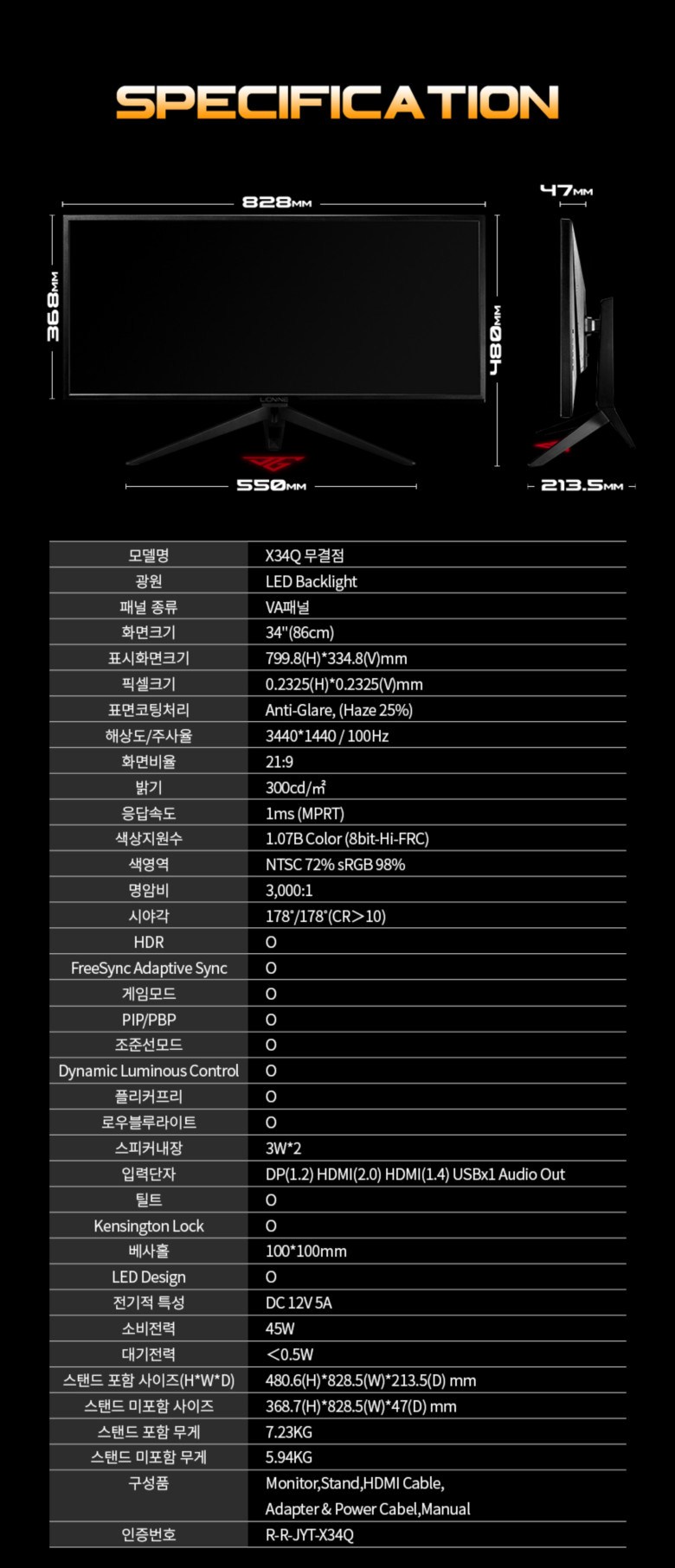 | 품명 및 모델명 | 주연테크 86cm WQHD 리오나인 울트라와이드 평면 게이밍모니터 HDR / X34Q | KC 인증정보 | 유/KC마크, R-R-JYT-X34Q |