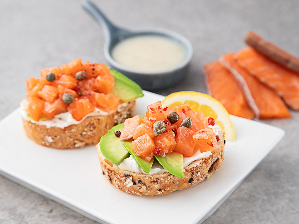 5. 훈제연어, 양파, 양상추를 고르게 올려주세요.