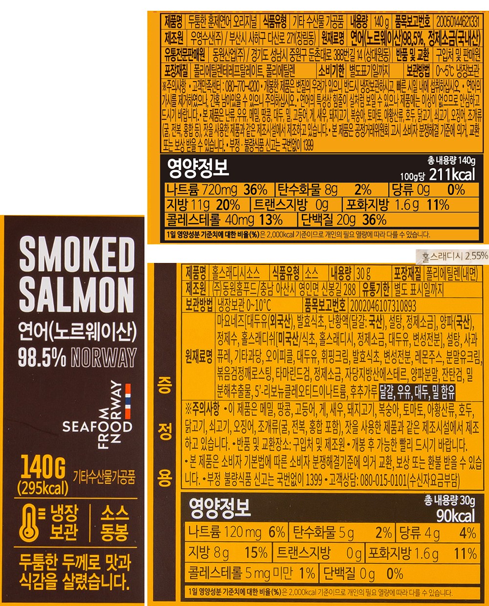 | 제품명 | 두툼한 훈제연어 오리지널 + 홀스래디시소스 | 식품의 유형 | 컨텐츠 참조 |