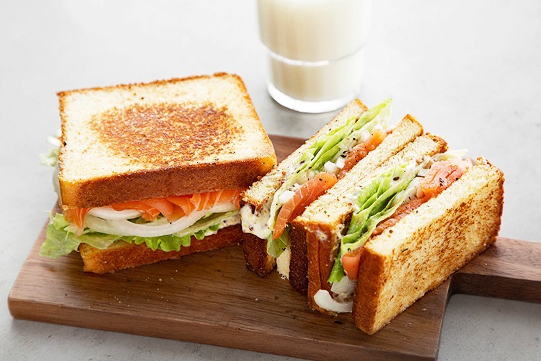 재료: 식빵 2쪽, 훈제연어 적당량, 양파 1/3개, 양상추 4장