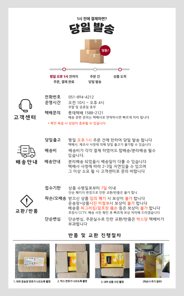 - ㆍ모니터 해상도의 차이로 인해 색상이나 이미지가 실제와 달라, 고객이 단순 변심으로 교환/반품을 무료로 요청하는 경우