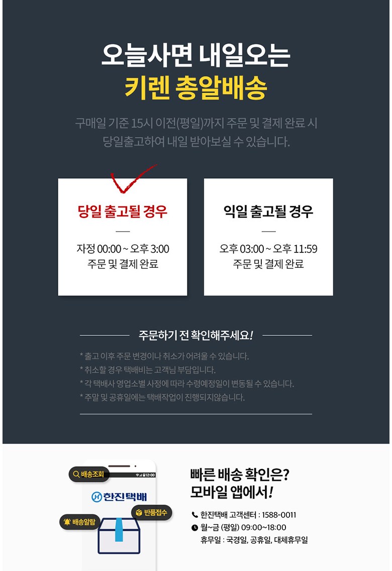 | 배송기간 | ㆍ도서산간 지역 등은 배송에 3-5일이 더 소요될 수 있습니다. - 천재지변, 물량 수급 변동 등 예외적인 사유 발생 시, 다소 지연될 수 있는 점 양해 부탁드립니다. | ||