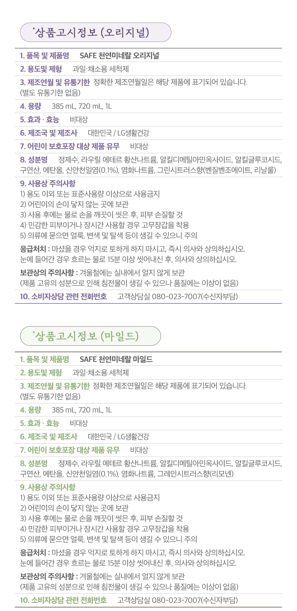 | 품명 및 모델명 | SAFE 천연미네랄 오리지널 | 인증/허가 사항 | 위생용품 |