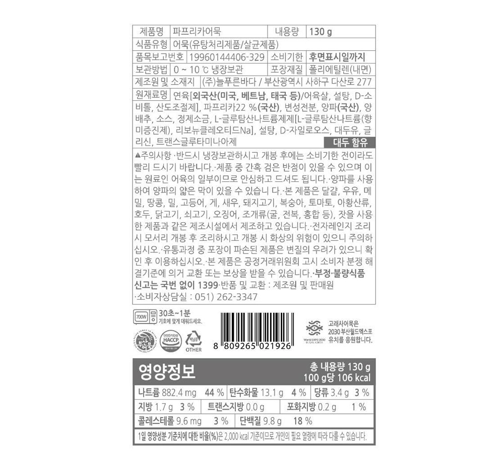 | 제품명 | 파프리카어묵 | 식품의 유형 | 컨텐츠 참조 |