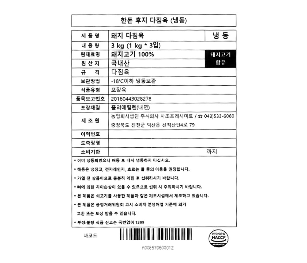 | 소비기한 또는 품질유지기한 | 소비기한(또는 유통기한) : 2026년 08월 29일 이거나 그 이후인 상품 | 세부 품목군별 표시사항 | 축산물 등급표시 : 해당 없음 / 이력번호 표시유무 : 이력번호 표시제품임 |