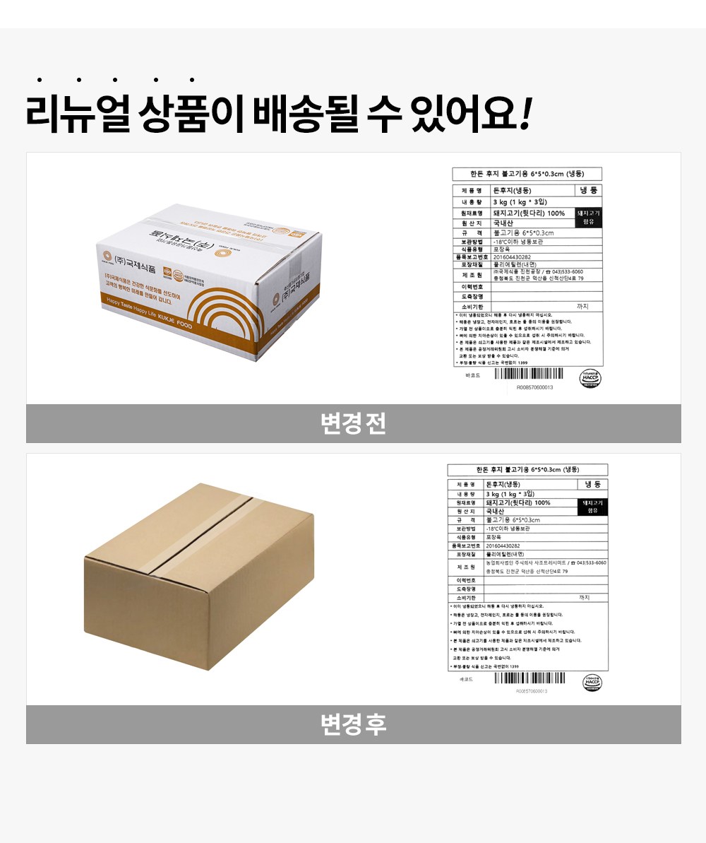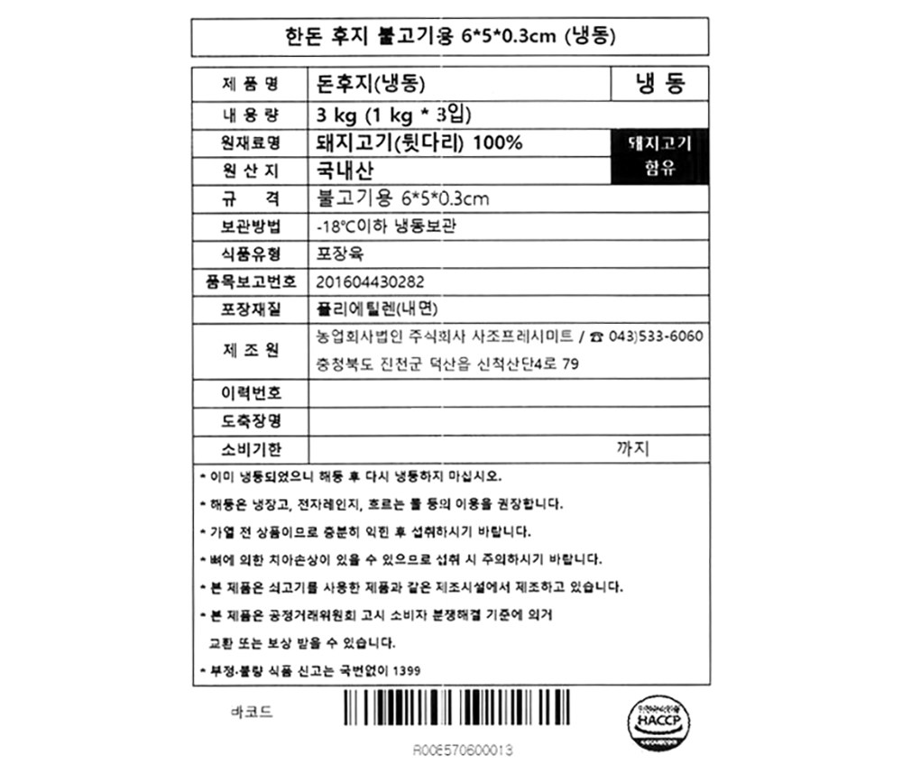 | 소비기한 또는 품질유지기한 | 소비기한(또는 유통기한) : 2026년 10월 06일 이거나 그 이후인 상품 | 세부 품목군별 표시사항 | 축산물 등급표시 : 해당 없음 / 이력번호 표시유무 : 이력번호 표시제품임 |
