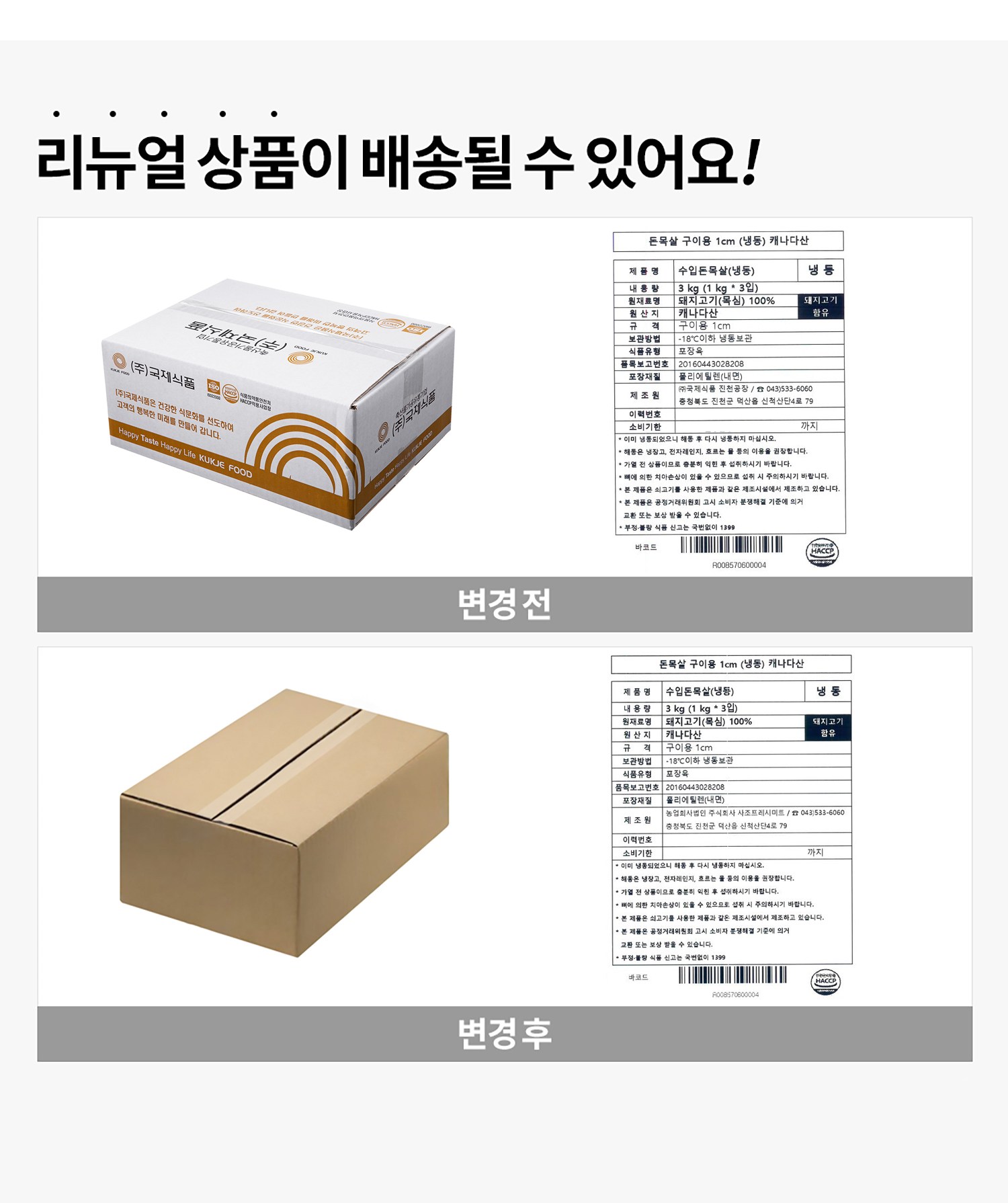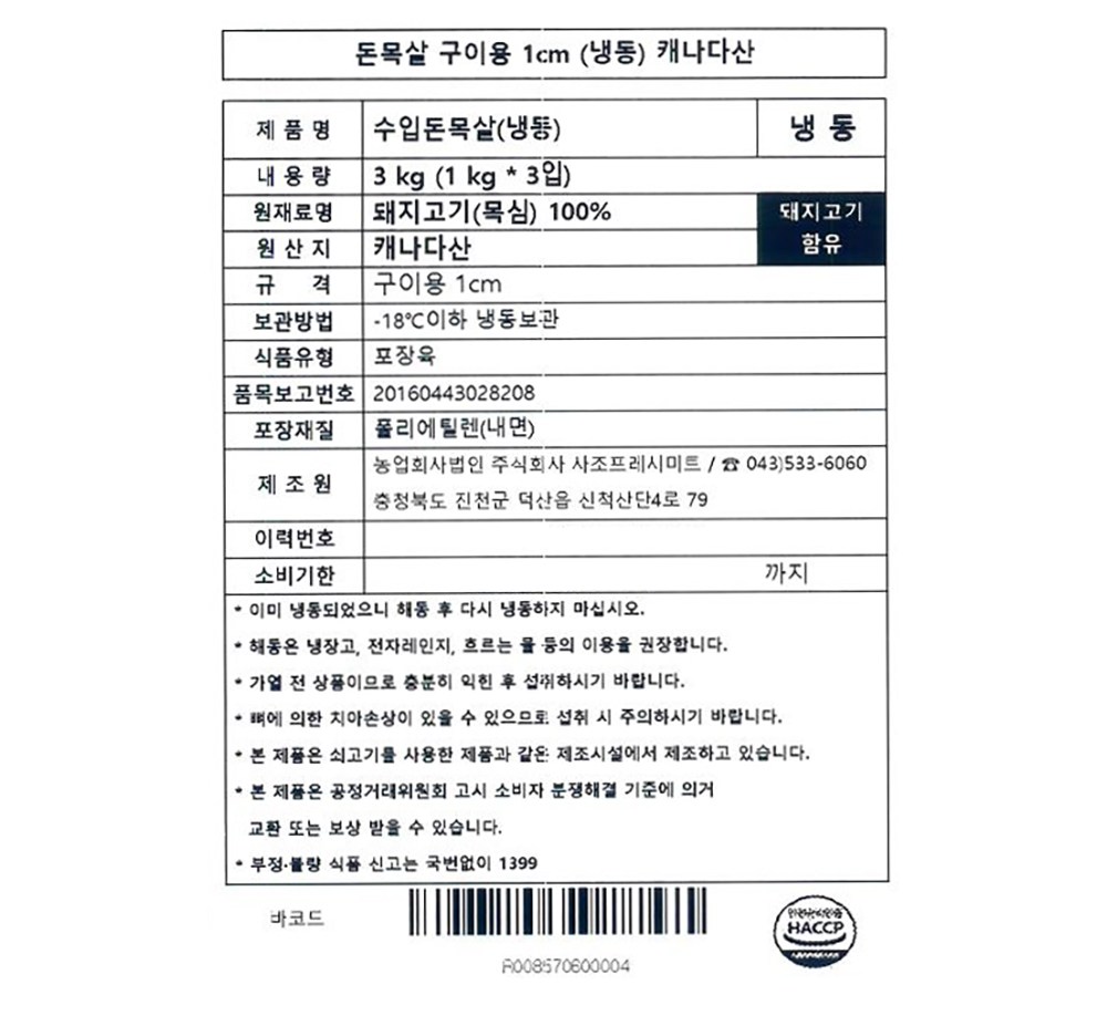 | 제조연월일, 소비기한 또는 품질유지기한 | 소비기한(또는 유통기한) : 2026년 05월 23일 이거나 그 이후인 상품 제조년월일 : 2025년 11월 25일 이후인 제조상품 | 세부 품목군별 표시사항 | 축산물 등급표시 : 해당 없음 / 이력번호 표시유무 : 이력번호 표시제품임 |