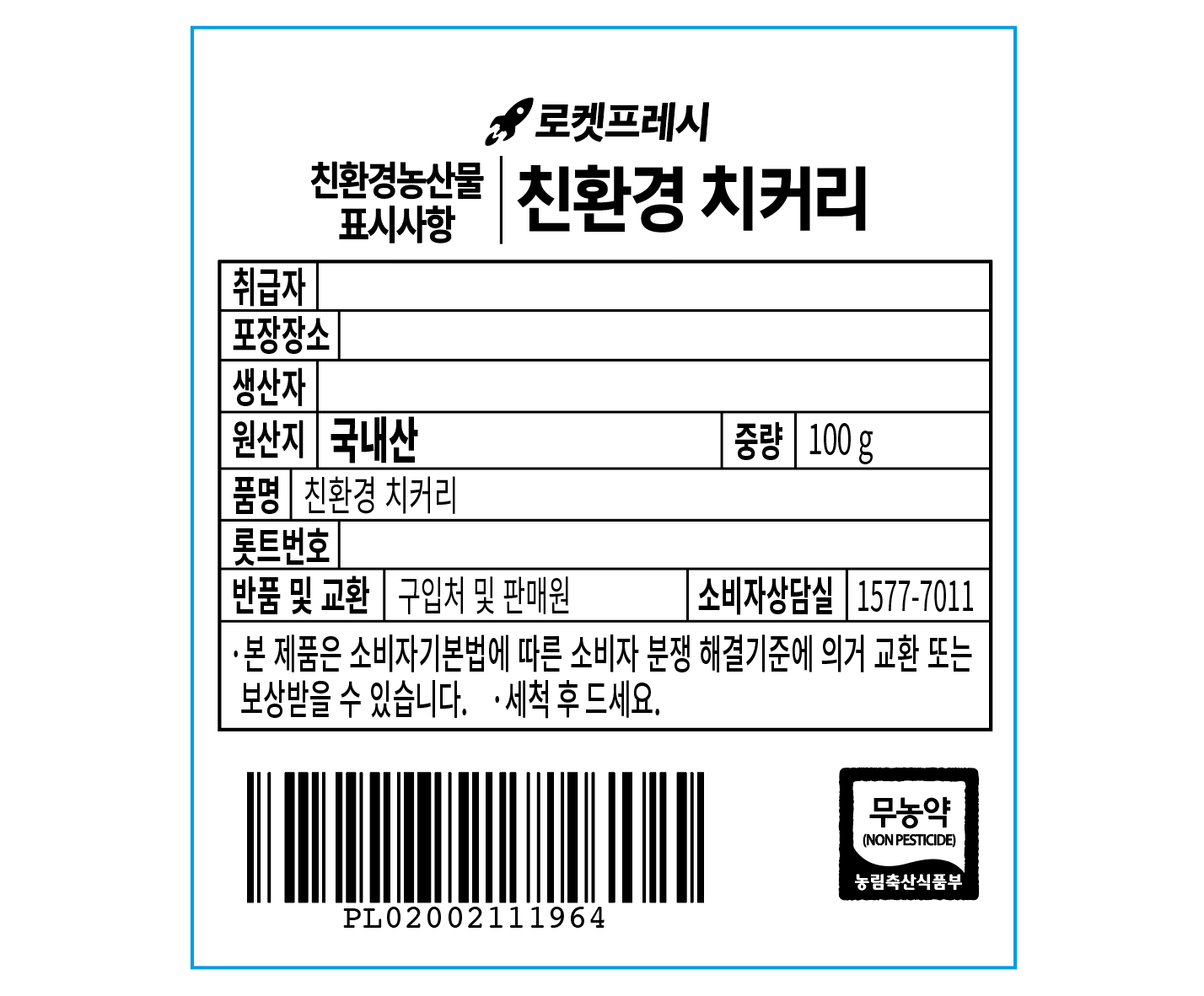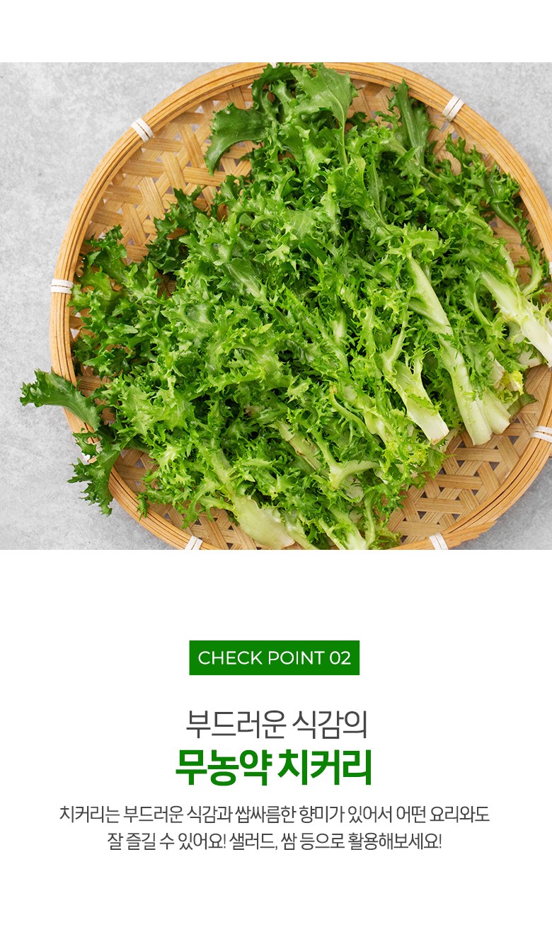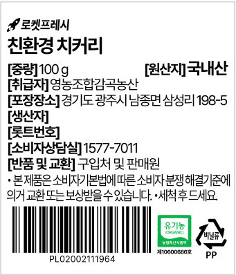 | 품목 또는 명칭 | 친환경 치커리 | 포장단위별 내용물의 용량(중량),수량,크기 | 100gx1개 |